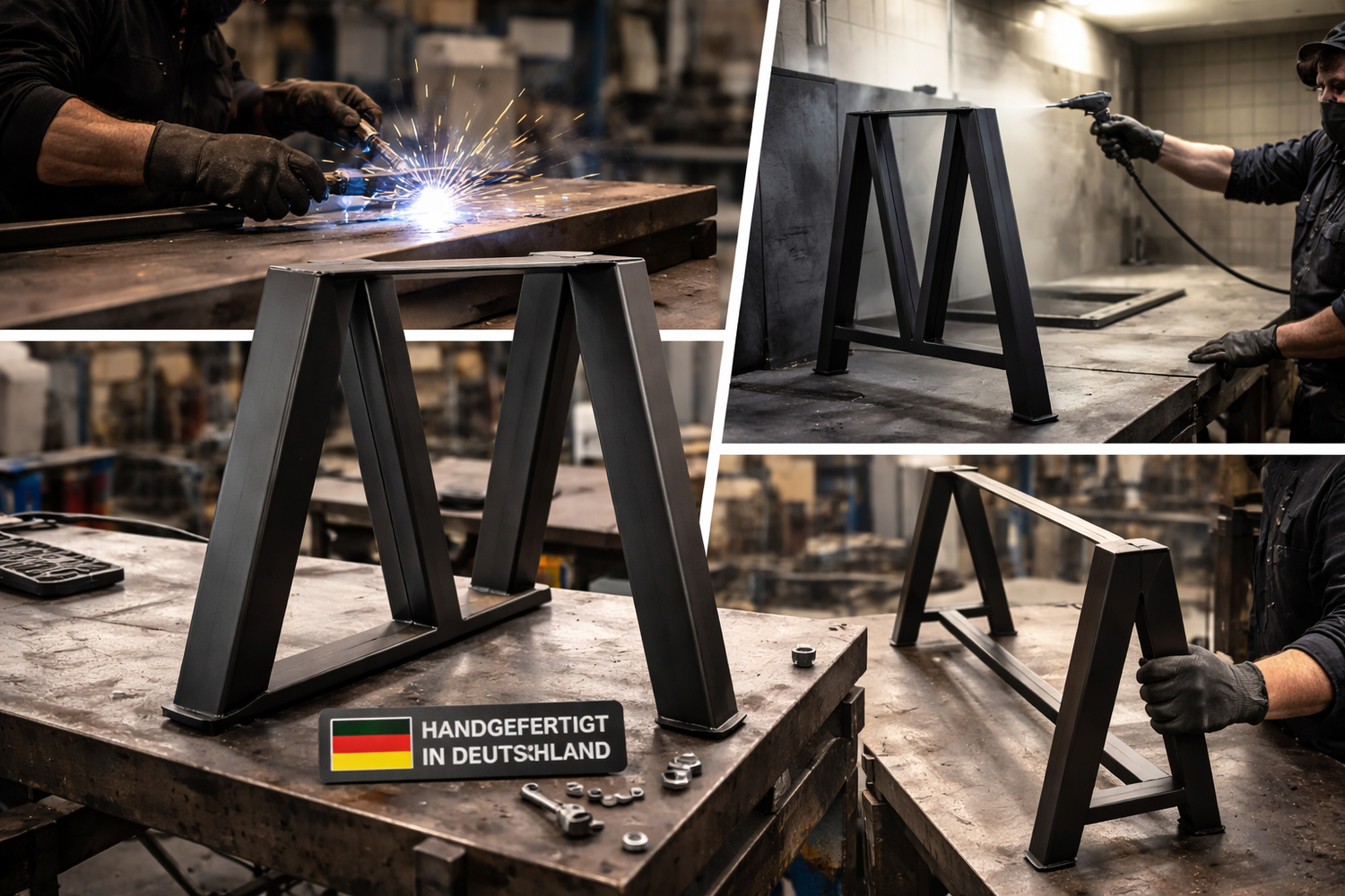 Unsere Metalltischbeine werden mit höchstem Anspruch an Präzision und Langlebigkeit in Deutschland handgefertigt. Jedes Gestell entsteht in sorgfältiger Handarbeit: präzise verschweißt, sauber geschliffen und je nach Wunsch hochwertig lackiert oder pulverbeschichtet.