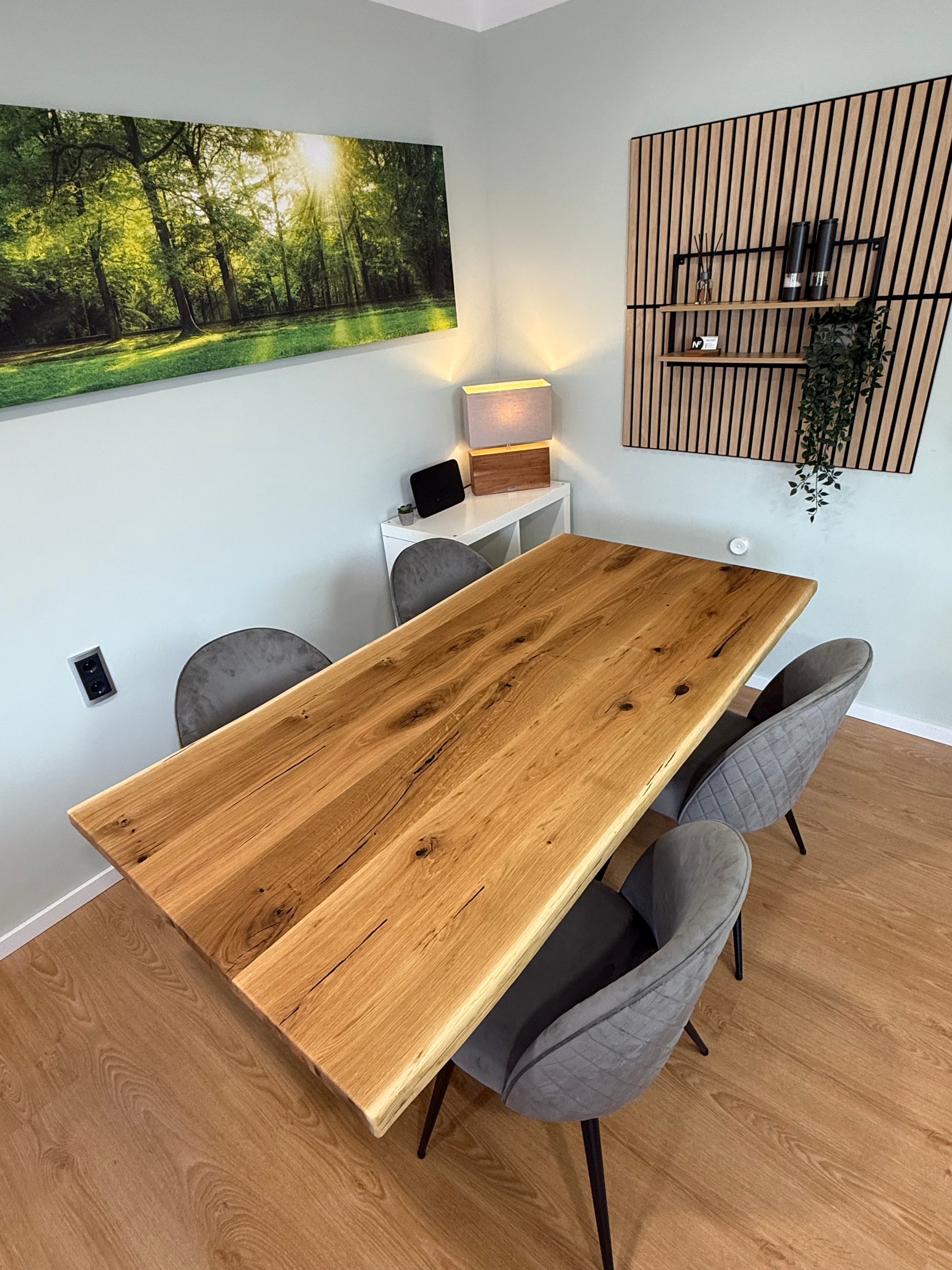 Dieser Tisch ist mehr als ein Möbelstück. Er ist ein Statement für Natürlichkeit, Qualität und ehrliches Handwerk. Die markante Maserung des Holzes, die gewachsene Baumkante und die natürliche Form machen ihn zum Mittelpunkt des Raumes.